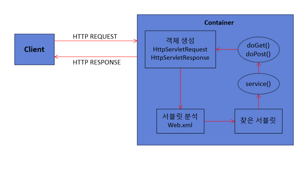 - 웹 프로그래밍에서 클라이언트의 요청을 처리하고 그 결과를 다시 클라이언트에게 전송(응답)하는 Servlet 클래스의 구현 규칙을 지킨 자바 프로그래밍 기술