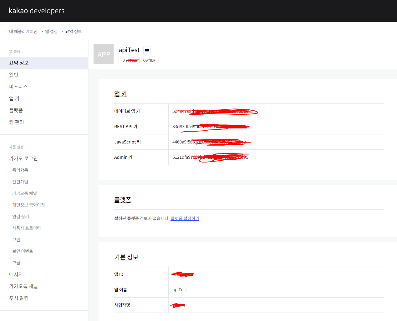- 네이티브 앱 키: Android, iOS SDK에서 API를 호출할 때 사용